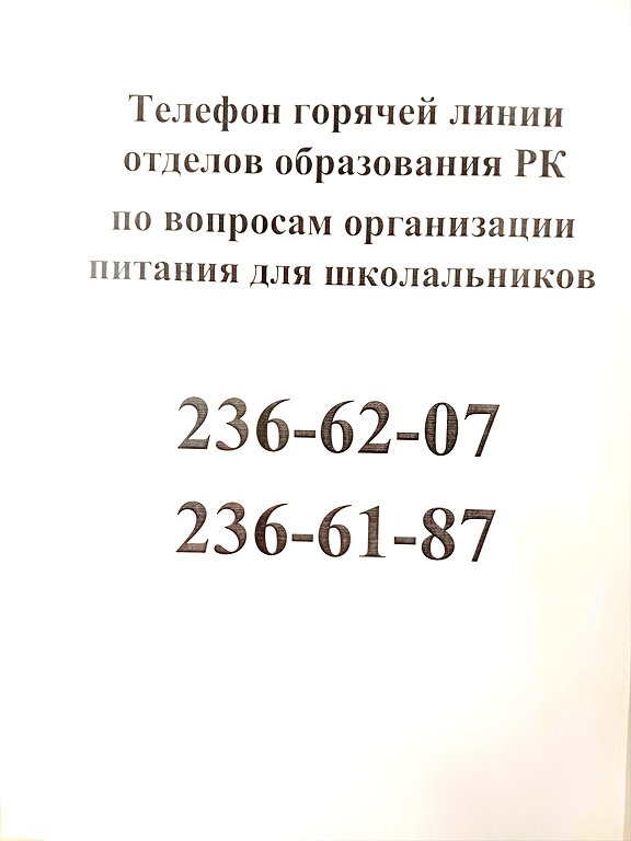 Қазақстан Республикасындағы білім бөлімдерінің мектеп оқушыларының тамақтануын ұйымдастыру мәселелері бойынша ыстық желі телефоны